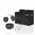 FETISH SUBMISIVE Apresenta este conjunto de punhos e pescoço em couro vegano com metal sem níquel! Prenda o seu amante com estas algemas sexy, eficazes e confortáveis. Um acessório clássico para seus jogos de bondage.