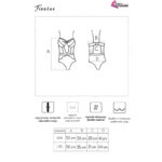 A cueca fecha facilmente nas costas, como um sutiã tradicional. É confeccionado em material flexível, adere ao corpo e realça as curvas naturais da mulher. Os seios são claramente enfatizados por aros confortáveis, e as tiras de material decorativo conectadas no meio do busto atraem a atenção. O material confortável e a capacidade de enrijecer levemente os seios fazem com que este body fique ótimo sob a roupa enquanto espera a noite.