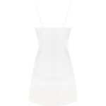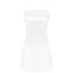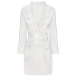 Um conjunto de roupa interior excepcionalmente bonito em cetim cru brilhante, um roupão com uma camisa que vai até o meio da coxa. A frente e as mangas compridas do roupão amarradas na cintura com um cinto são decoradas com lindas rendas. T-shirt com alças finas ajustáveis, decorada com a mesma renda no busto. Tanga incluída.